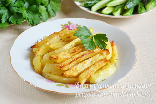 Вкуснейшую запеченную картошку в майонезе перекладываем на тарелки и сразу подаем как основное блюдо с любимыми соусами, малосольными или солеными огурчиками и белым хлебом. Или подаем ее в качестве гарнира к мясным и рыбным основным блюдам.